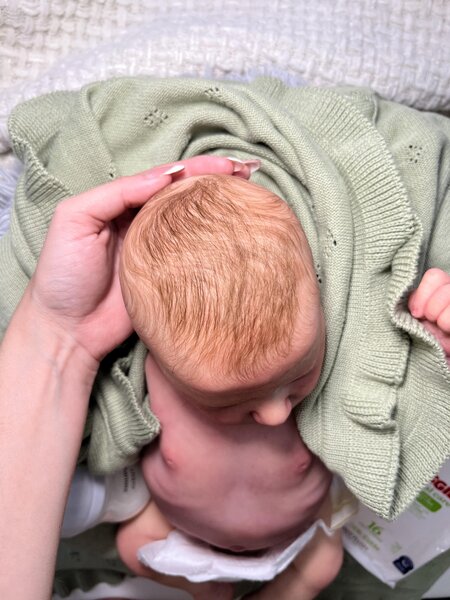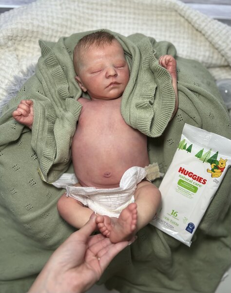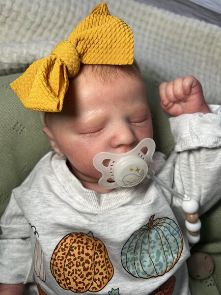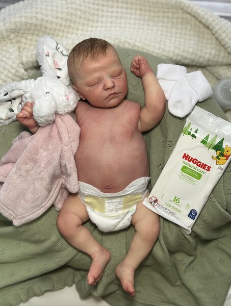 Putting this sweet girl up for adoption. She is a Quinn kit and is a girl. COA included. She is breathtaking and done by the one and only Alicia Garner from silicone dolls Reborn Nursery. I sent her back to Alicia after purchase for some light rooting on top of head and her belly Plate is done by another great artist by the name of Kimberly Ann from A Baby’s Journey Reborns. Let me know if anyone is interested, she will come home with a box FULL of outfits, socks, bibs, pacifiers, bows, hats, shoes, mittens, blankets, her front plate etc. (chosen by me of what I have) she weighs about 8 pounds and head needs supporting like a real baby. She is 20 inches long and normally wears 0-3 month clothing, hardly newborn only if it’s a big newborn size.